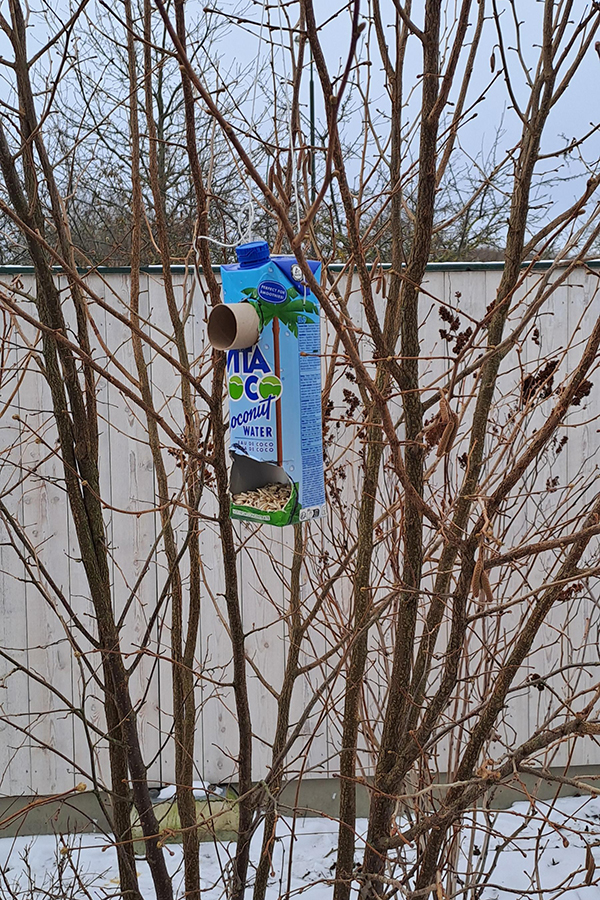 Förskolans lärmiljöer fylldes med fågelbilder och inspiration. Barnen designade och byggde egna fågelmatare av mjölkkartonger och återbruksmaterial, samtidigt som de tillsammans tillverkade fågelmat av fett och frön.